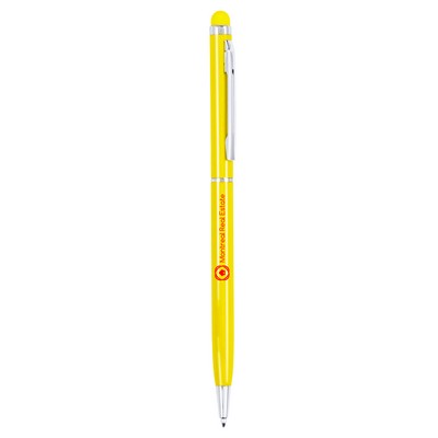 Description : Stylo tactile avec embout de caoutchouc en couleur, finition brillante