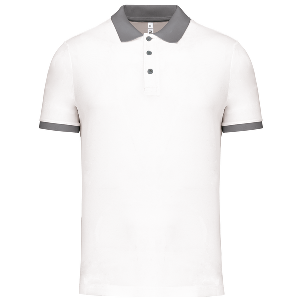 100% polyester. Maille piquée Cool Plus®. Coupe ajustée et look moderne. Col et bas de manche en bord-côte contrasté. Patte de boutonnage 3 boutons (contrastés ou unis selon modèle). Fentes latérales.